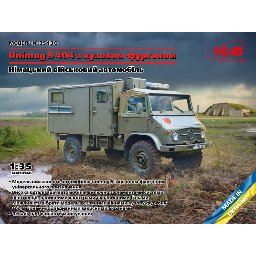 Set for assembling one model Unimog S 404 - German military truck with van body 1/35 ICM 35136